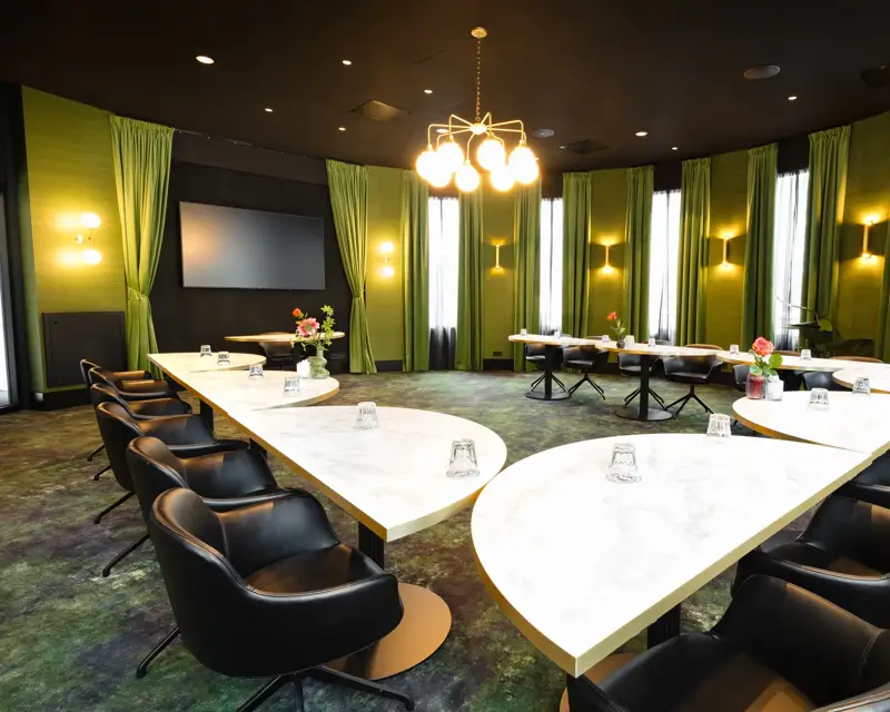 Salon Limone ist ein wunderschöner und stimmungsvoller runder Raum, ideal für Meetings, Zusammenkünfte und Abendessen. Durch seine runde Form, die großen Fenster und das farbenfrohe Interieur entsteht eine inspirierende und einladende Atmosphäre. Der Raum bietet eine semi-flexible Bestuhlung und ist mit bequemen Schalensesseln für ein angenehmes Meeting-Erlebnis ausgestattet. Zudem verfügt er über eine moderne Klimasteuerung sowie die neueste audiovisuelle Technik, darunter ein großer TV-Bildschirm, für ein optimales Präsentationserlebnis.