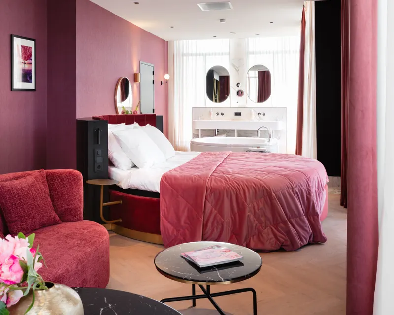 In der 12. Etage des Hotels befindet sich diese einzigartige Penthouse-Suite, in der sich Luxus und Komfort vereinen. Die warmen Rosétöne schaffen eine stilvolle und intime Atmosphäre. Das absolute Prunkstück des Zimmers ist das extragroße runde Kingsize-Bett mit einem Durchmesser von nicht weniger als 250 cm. Darüber hinaus verfügt die Suite über eine gemütliche Couch am Kamin und eine großzügige private Terrasse mit herrlichem Blick über die Stadt, komplett mit Terrassenmöbeln.