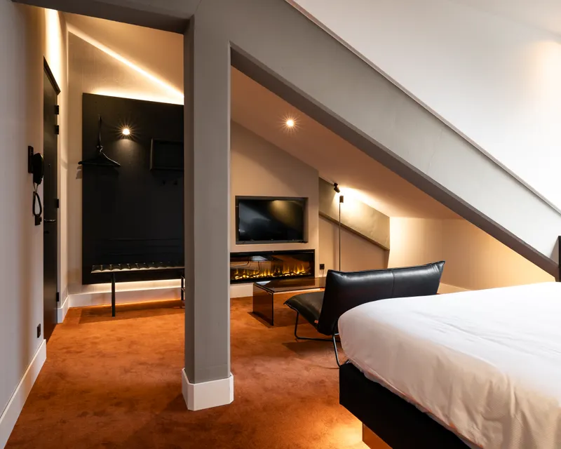 This loft is located on the top floor of the PTT Hotel. The room features a luxurious king-size bed with a topper, a deluxe Espresso coffee machine, a cozy seating area by the fireplace, a safe, a minibar, a smart TV, and free WiFi.